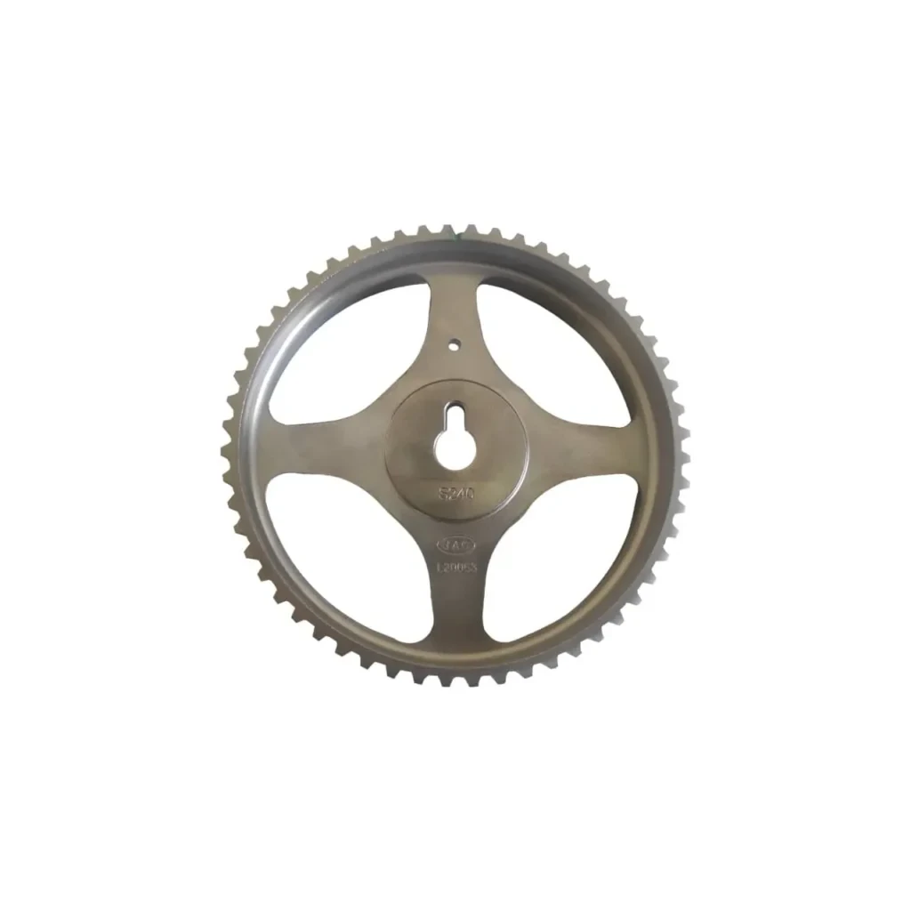 این قطعه با داشتن دندانههای دقیق، با تسمه یا زنجیر تایمینگ درگیر شده و چرخش میل لنگ را با نسبت مشخصی به میل سوپاپ منتقل میکند. این هماهنگی برای حفظ قدرت و راندمان موتور حیاتی است.